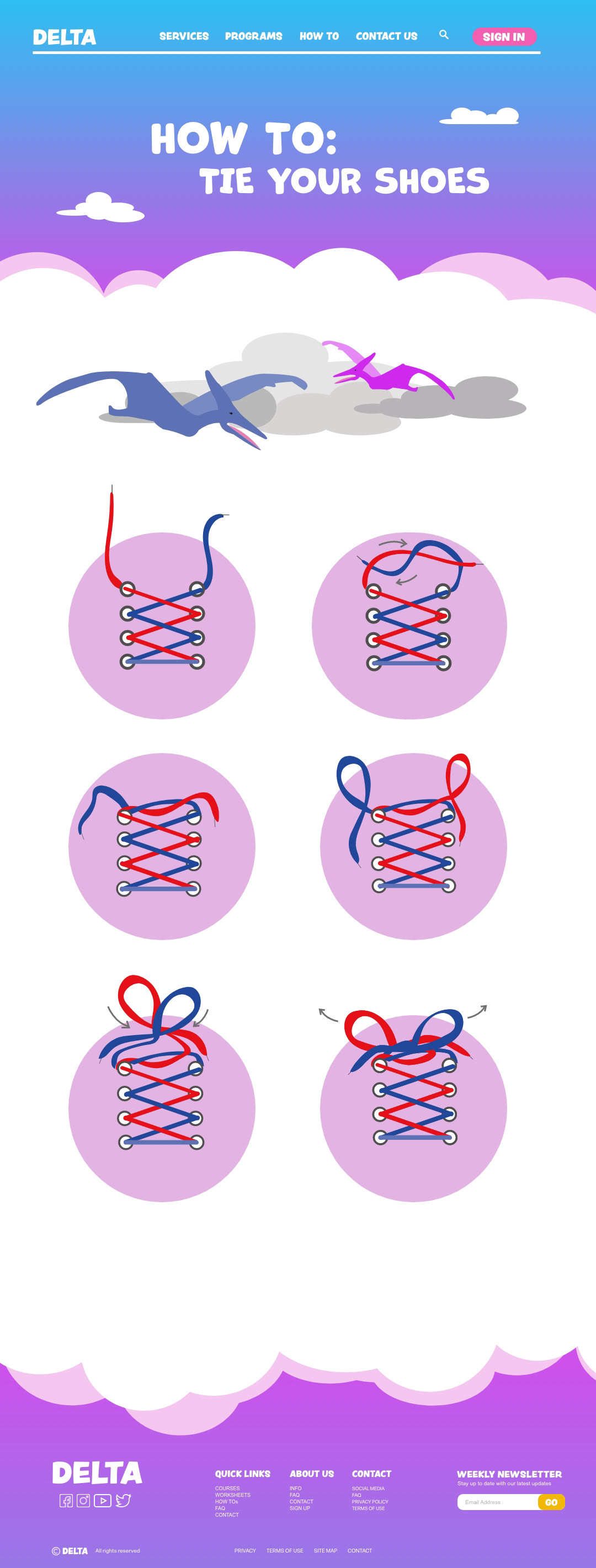 Delta is a children's learning site. One of the pages show them step by step instructions on how to tie their shoes